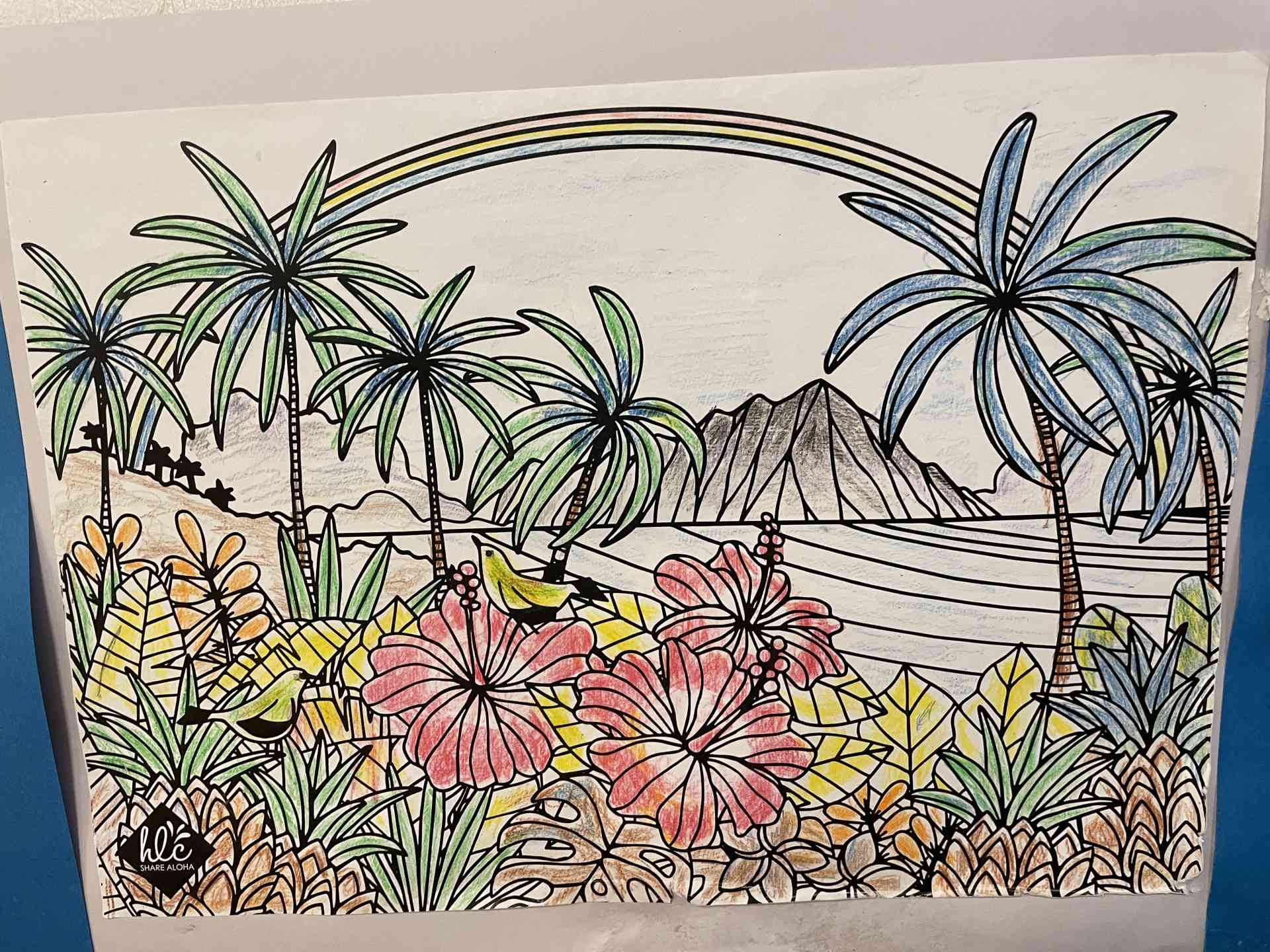 他ユニットにもお邪魔してみました。スタッフともにフラダンスのイラストが書かれた塗り絵をして楽しまれています。