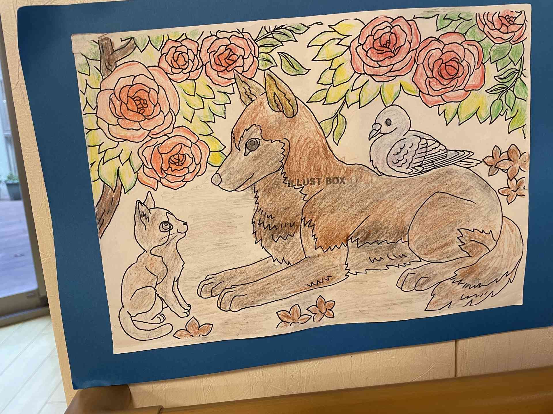 こちらの塗り絵には、犬・アヒル・猫の絵が塗られていてカラフルです。