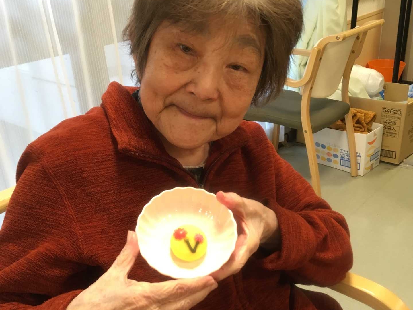 12日のとどろき一倫荘の15時のおやつはカーネーションの模様が練り切りでした。